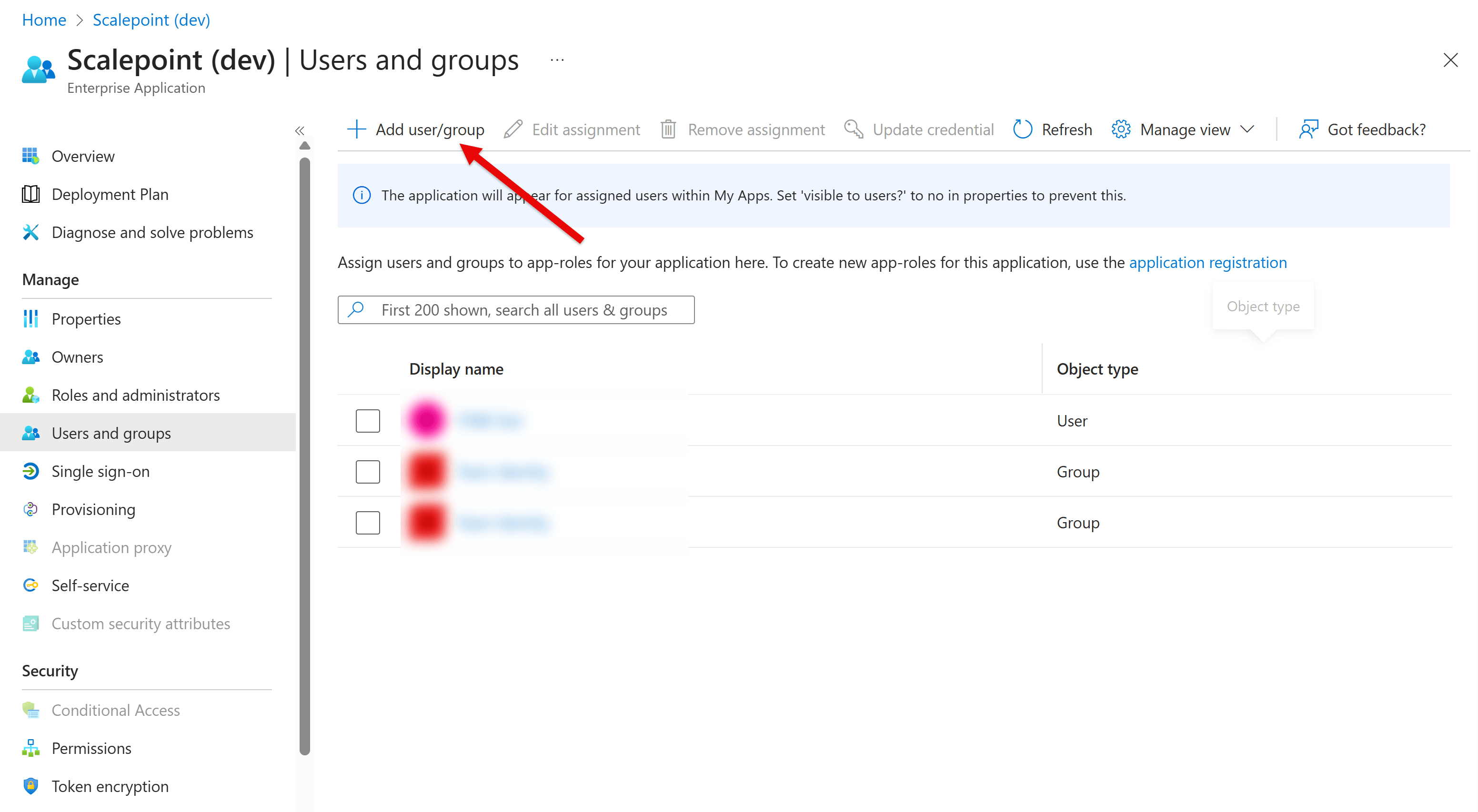 User's groups in your Entra ID are not visible to Scalepoint automatically. You have to assign any groups that you want to make visible in the Enterprise app's "Users and groups". Repeat the user assignment steps from the App roles section, but choose application role Custom access
