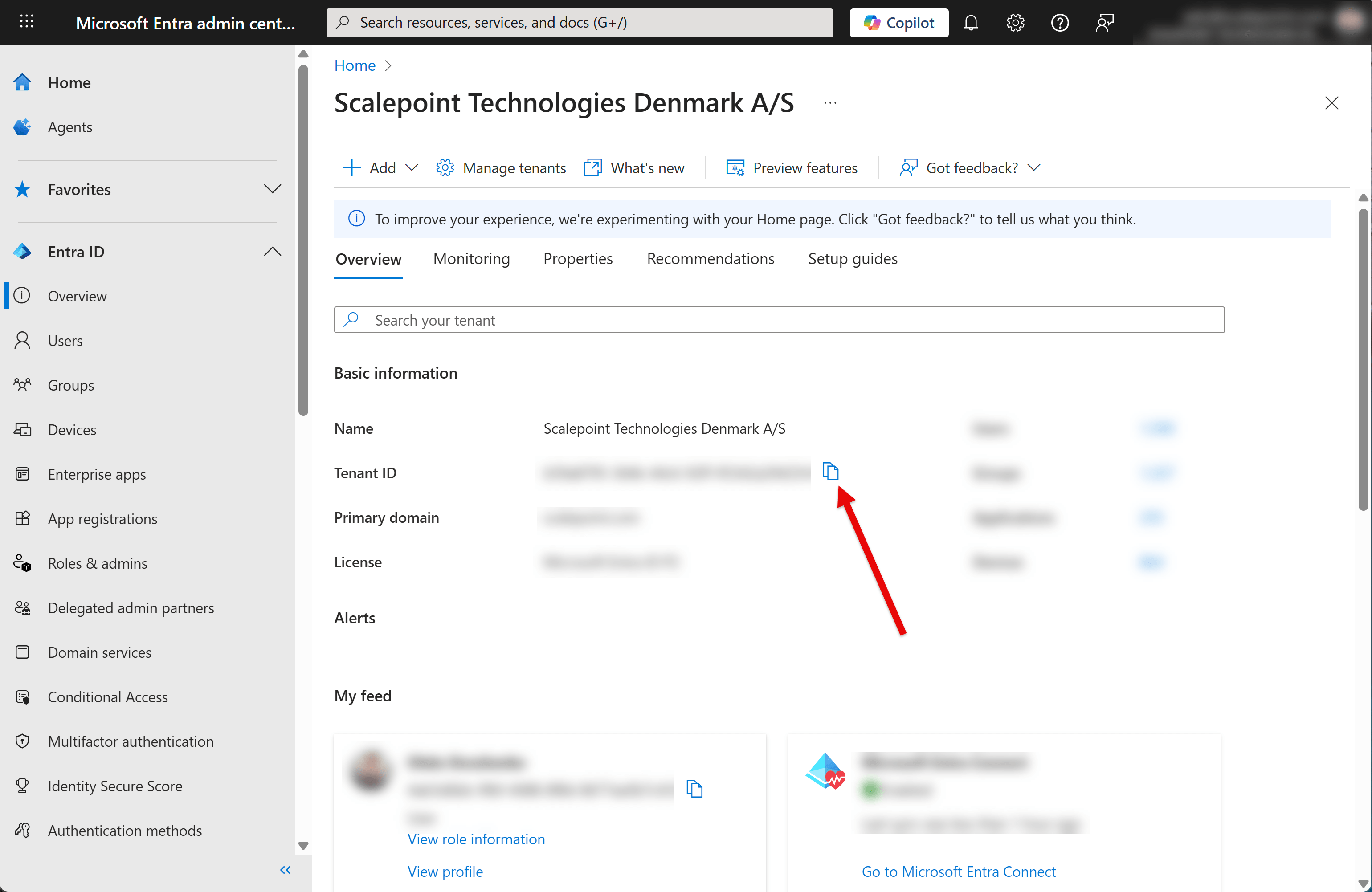 To get it, go to your Entra ID >> Overview and copy your Tenant ID value. Please provide Scalepoint with this value. It is needed to associate your organization's Entra ID tenant with the tenant in Scalepoint ID.
